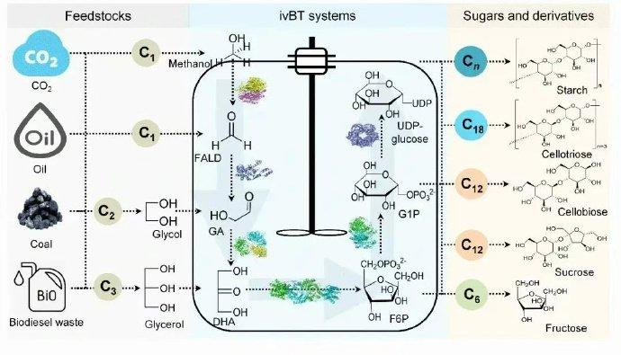 如果进一步将二氧化碳固定后,或从工业废弃物中获取甲醇等低碳分子,并将其生物转化为糖分子,那将提供一种不依赖于土地种植的全新制糖模式。